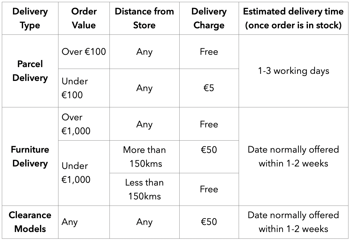 Please note, any cancellation of delivery within 24 hours of the delivery date will incur a failed delivery charge of €50. This charge will also apply if no-one is present to receive your delivery at a time agreed. Similarly, if you choose not to accept your new furniture for reasons other than damage you will also incur a removal charge of €50.
